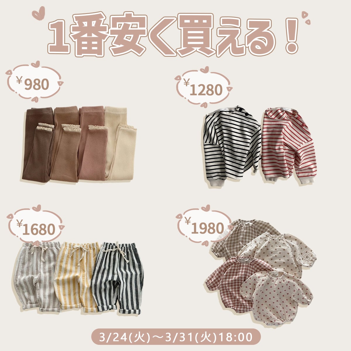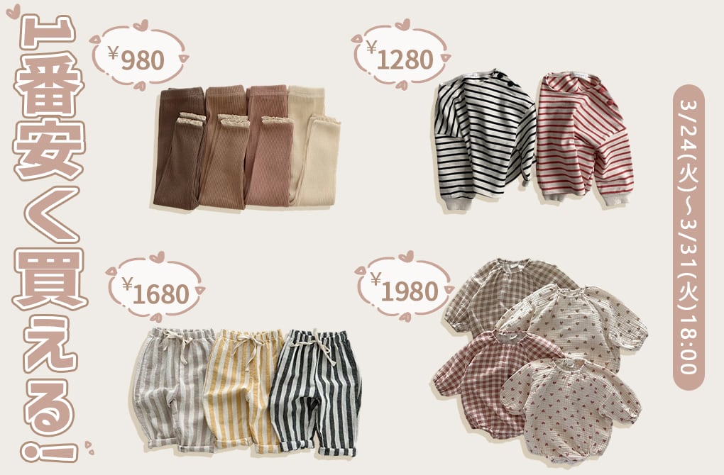 いつもBakerをご愛顧頂き誠にありがとうございます。🌷🌷🌷 お客様に感謝の気持ちを込めて、全品38%OFFセール開催中♪ 🎆 更に対象商品は特別価格999円でゲットできます♪ 数量限定で、早い者勝ち! 🕰時間限定:[2026/3/24(火)~3/31(火)18:00] 今だけお気に入りのお洋服は最安値で買えます。