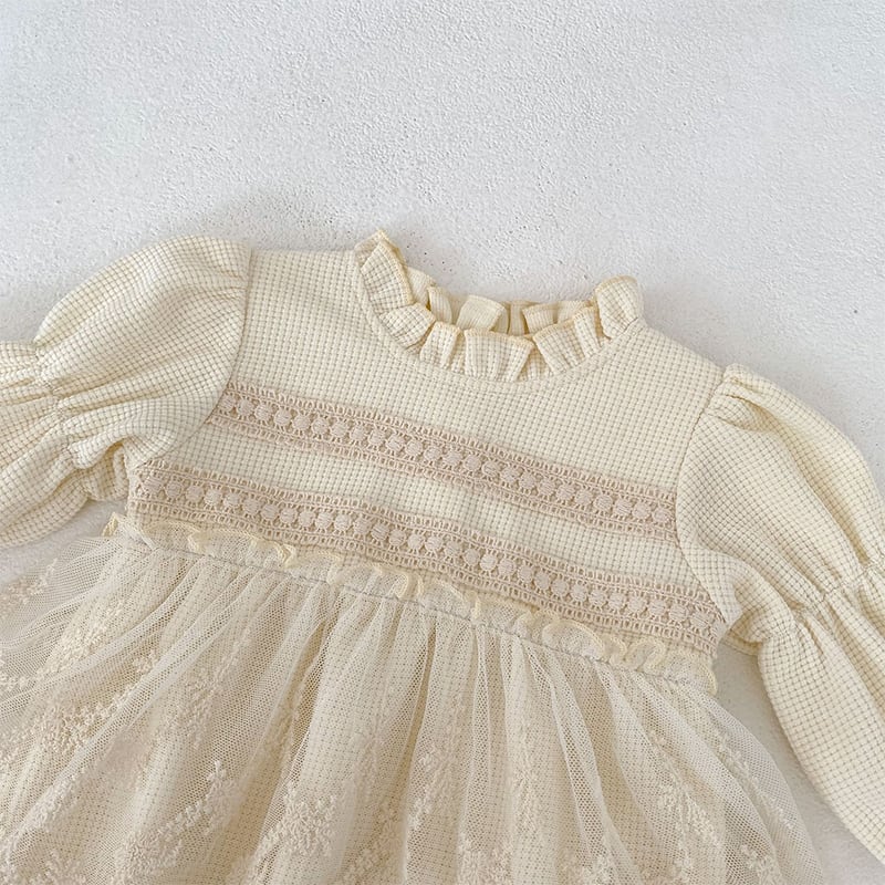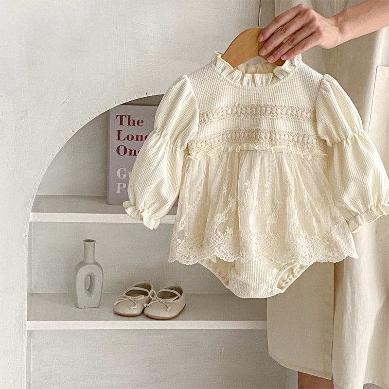 【BABY】秋作ワッフル生地レースフリルロンパース