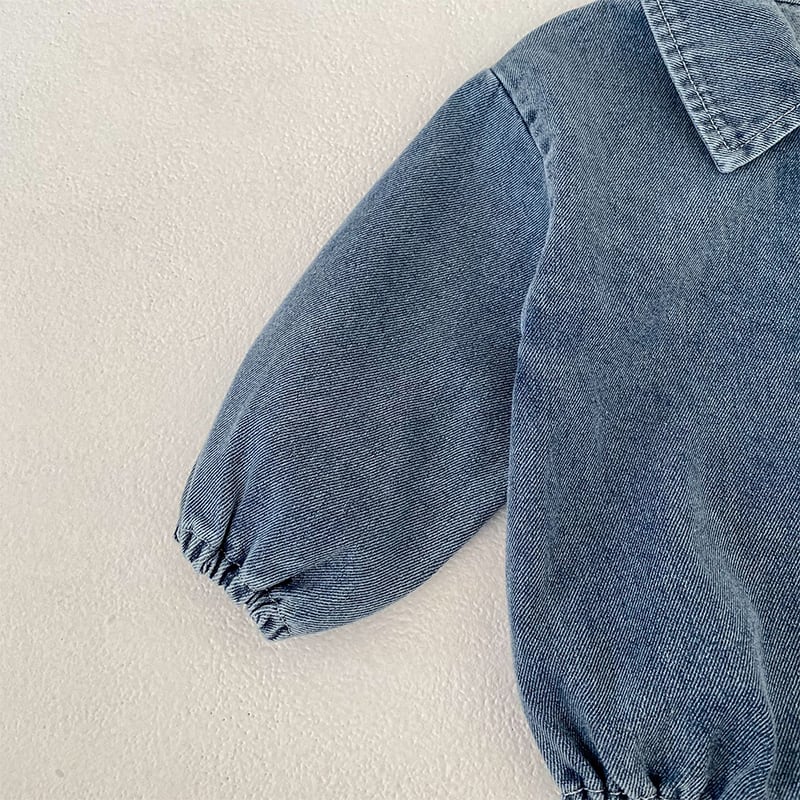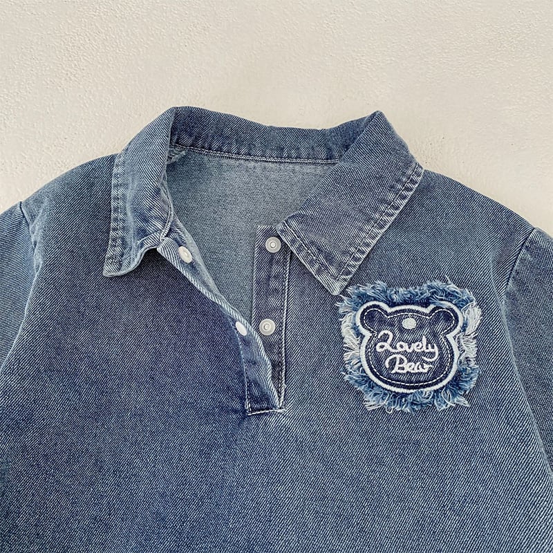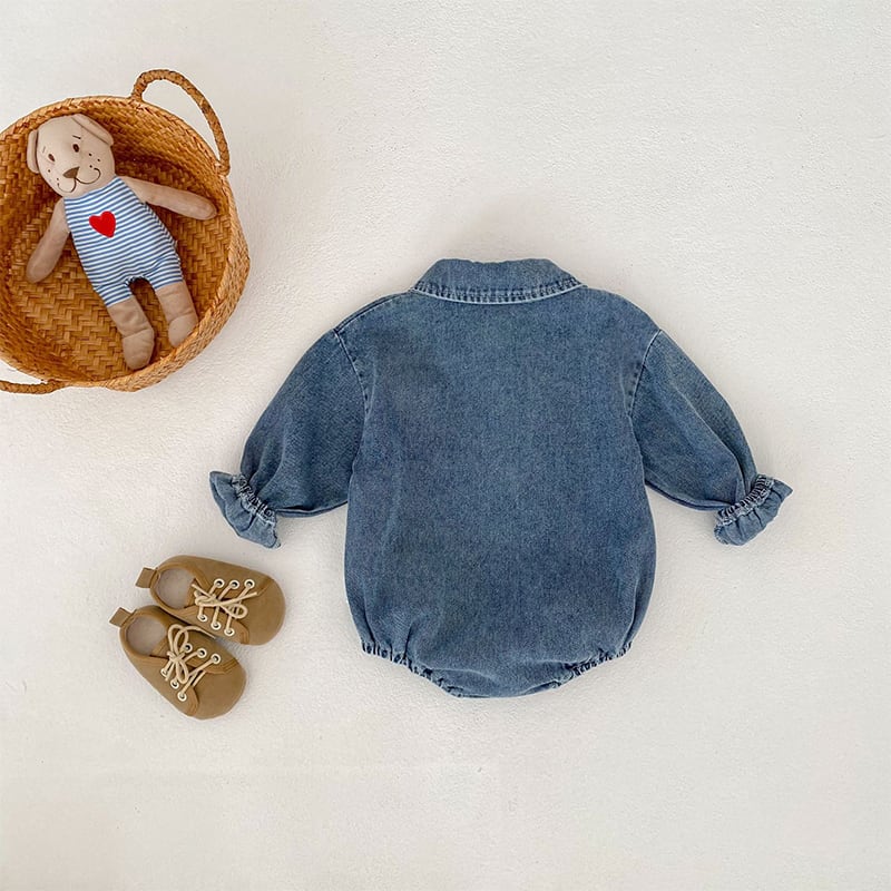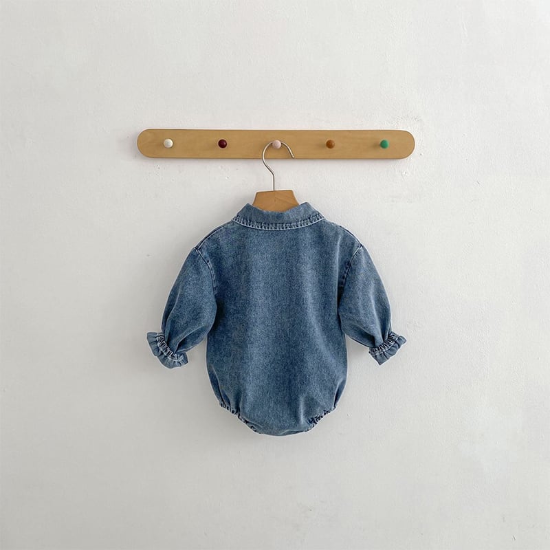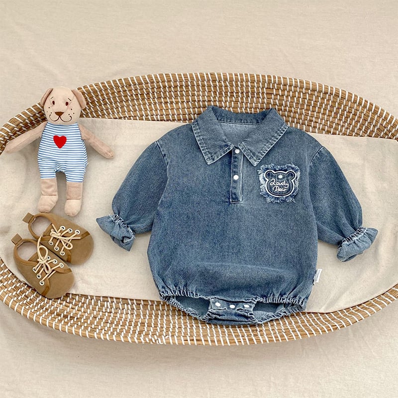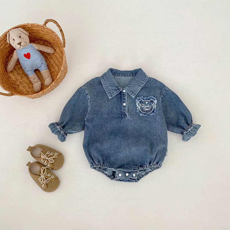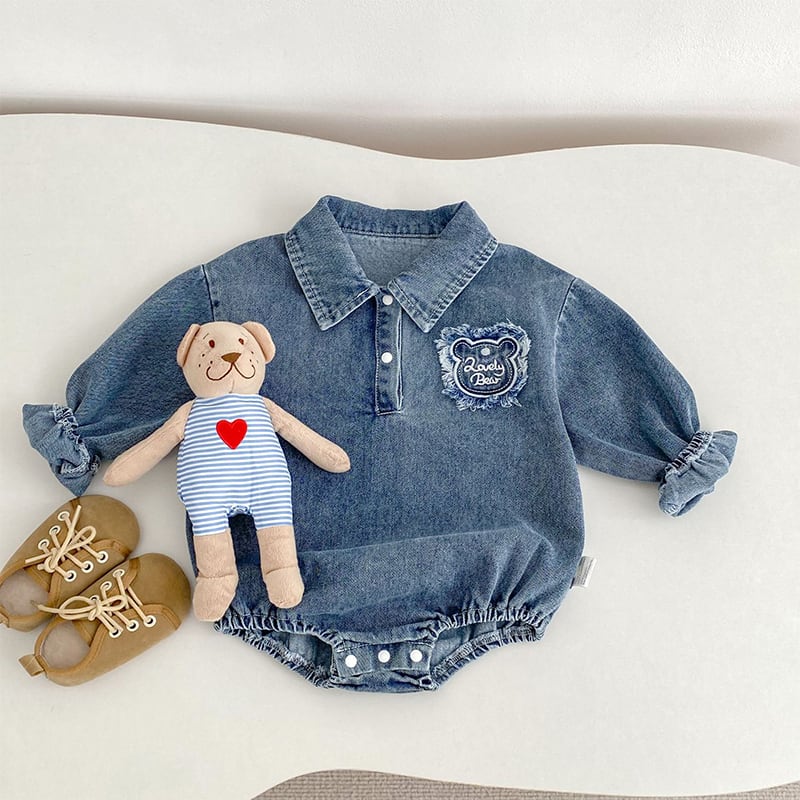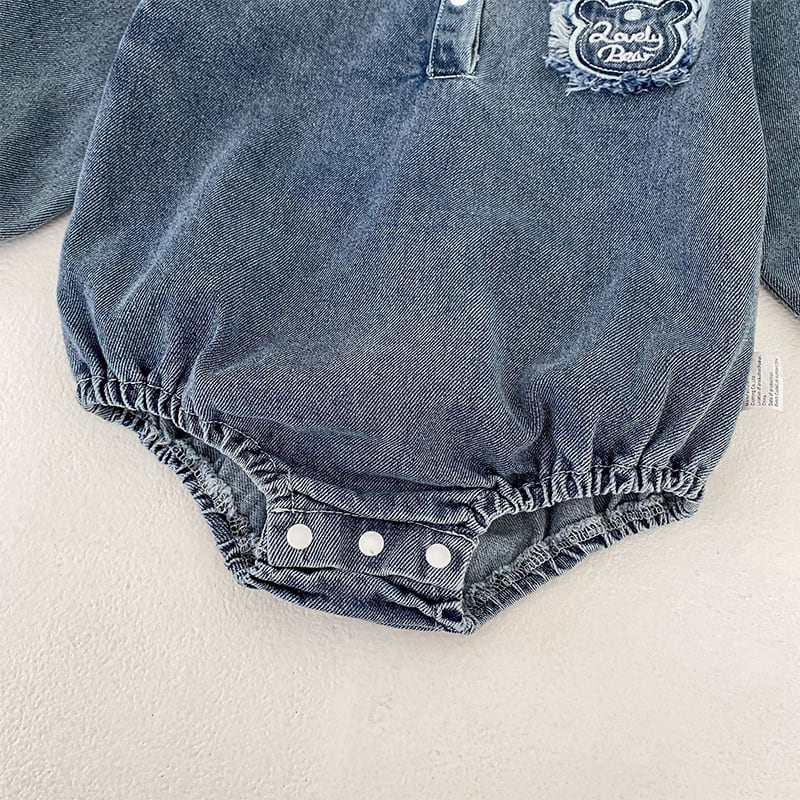 【BABY&KID】春作クマ柄刺繍入りデニムロンパース
