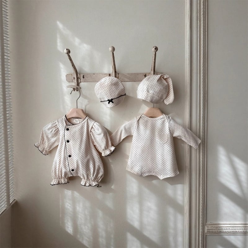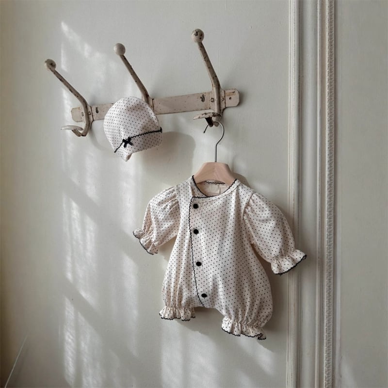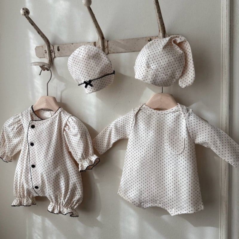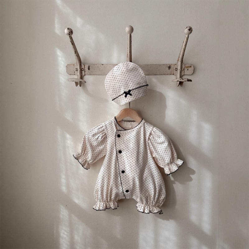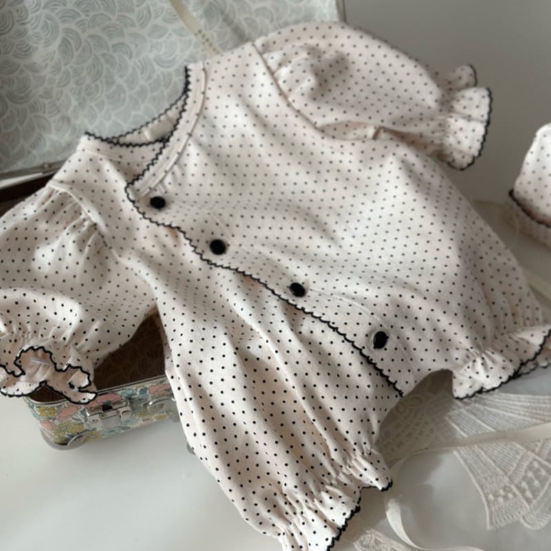【BABY】春作ドット柄フリル付きロンパース&帽子