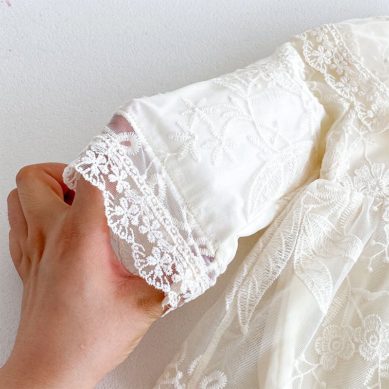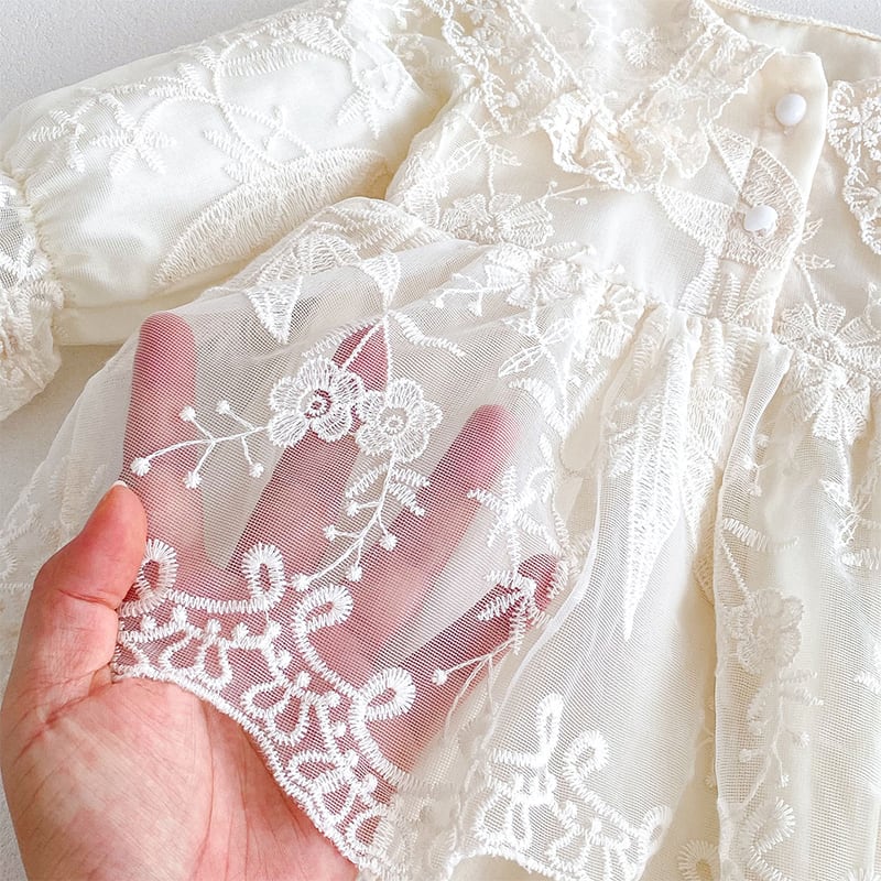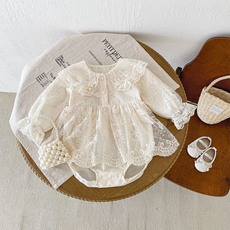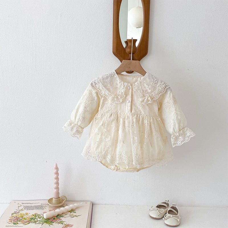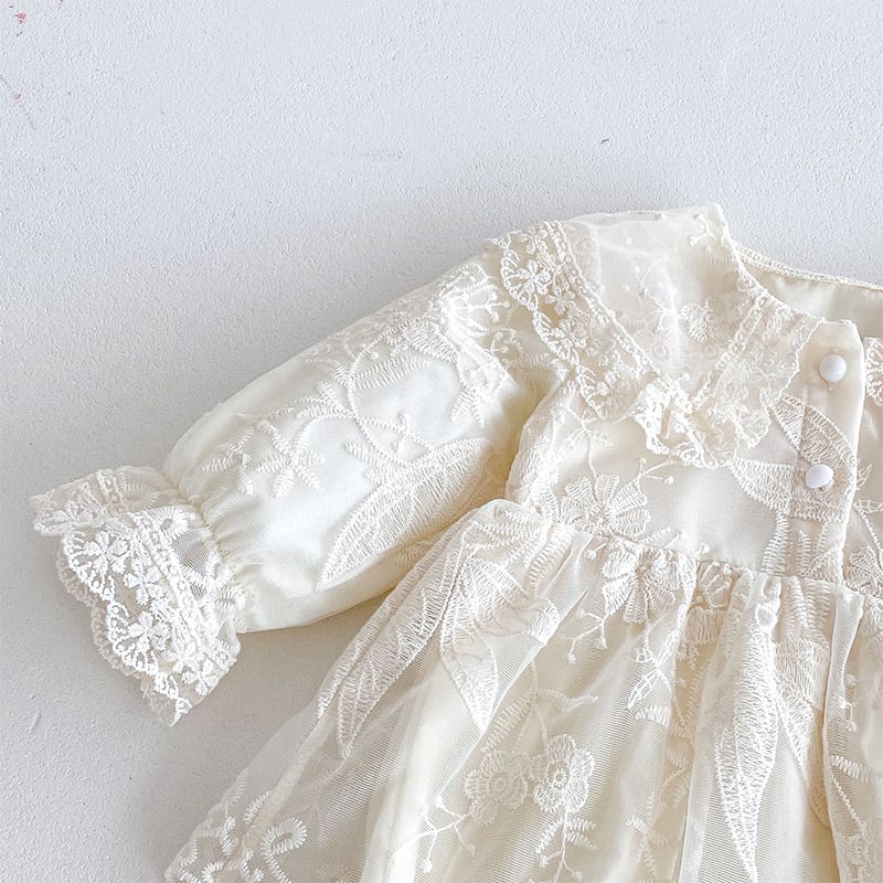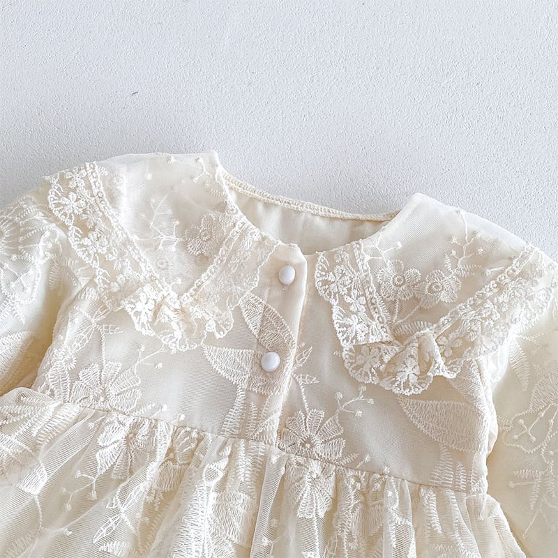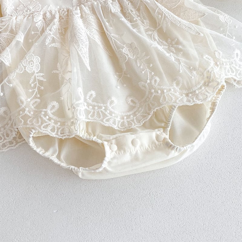 【BABY】春作レース透け感フリル襟バブルスリーブロンパース